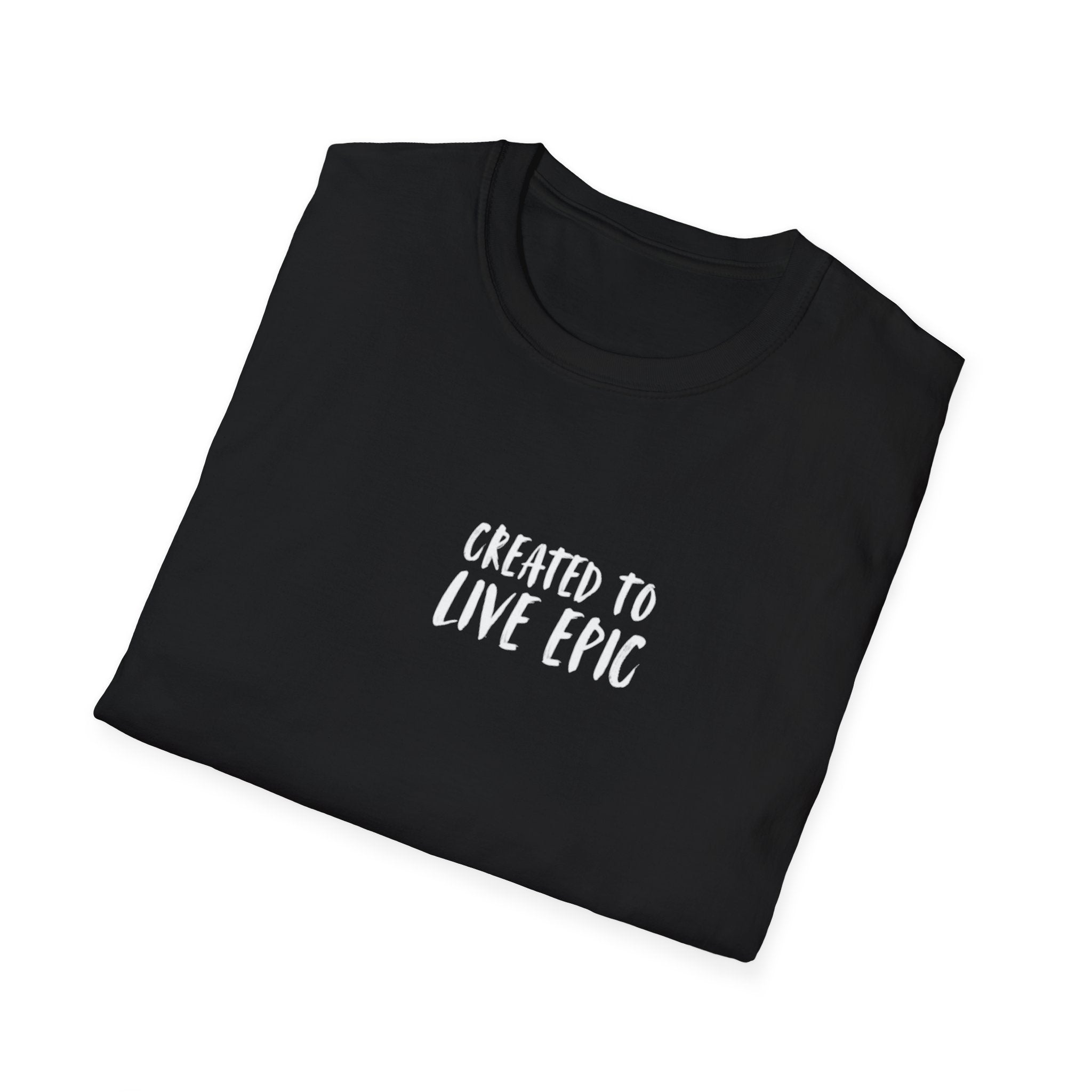 Lightweight, whisper-soft tee with a clean crew neckline and a small, confident chest print that reads “Created to Live Epic.” This shirt carries quiet energy — minimalist typography on a smooth black canvas that slips easily into everyday life. Wear it for morning runs, coffee runs, or late-night road trips. The fit sits classic and comfortable, letting the message speak without shouting. Built to last through washes and miles, it ages with character thanks to its durable ring‑spun cotton and stable construction details like shoulder tape and a ribbed collar. Subtle, bold, and made to move with you.